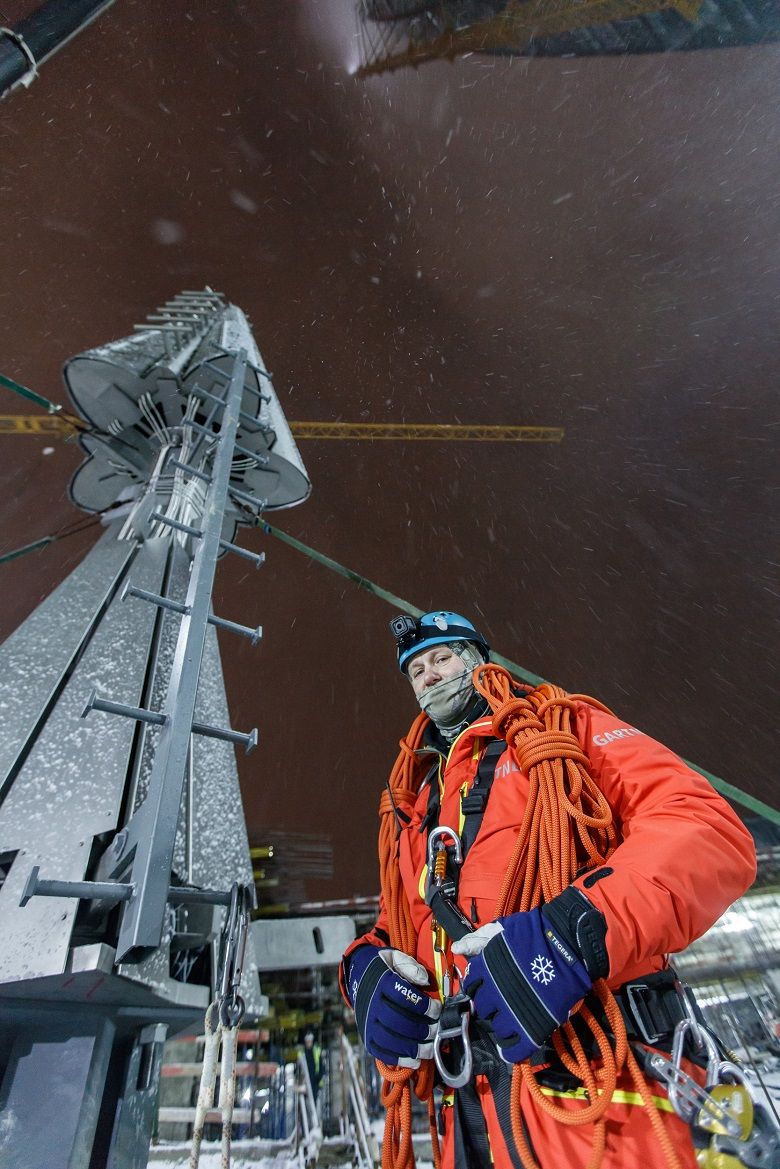 Альпинистское снаряжение – верный признак строителя-высотника. Для всех, кто выходит на открытые конструкции – в частности, на шпиль, обязательны пятиточечная привязь и непрерывная страховка в двух местах.